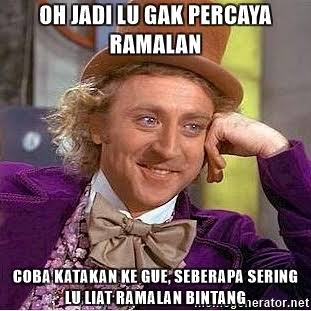 Akan tetapi, banyak pula pihak yang tidak ingin memercayai ramalan karena menganggap hal itu menyalahi agama. Pro kontra soal ramalan nyatanya juga turut memengaruhi kreativitas sejumlah orang. Terbukti kumpulan meme di bawah ini yang telah dirangkum oleh Okezone, Minggu (25/3/2018) membahas hal-hal seputar ramalan. Berikut ulasannya.