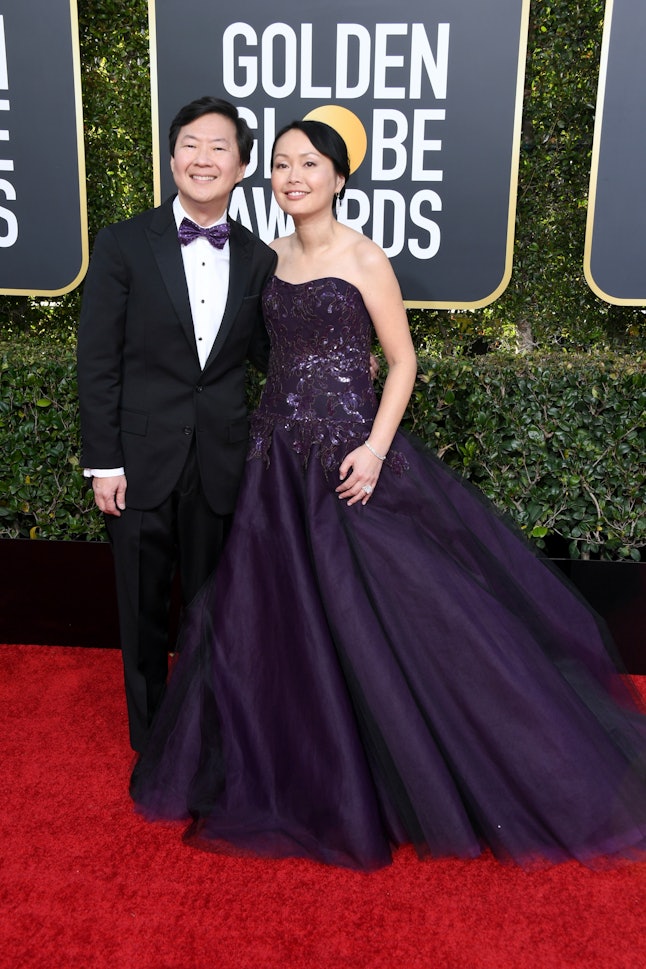 Ken Jeong hadir bersama istrinya dan ia tampil dalam balutan tuksedo formal. Biar makin kompak, tak lupa Ken memakai dasi kupu-kupu warna ungu yang serasi dengan warna gaun istrinya.