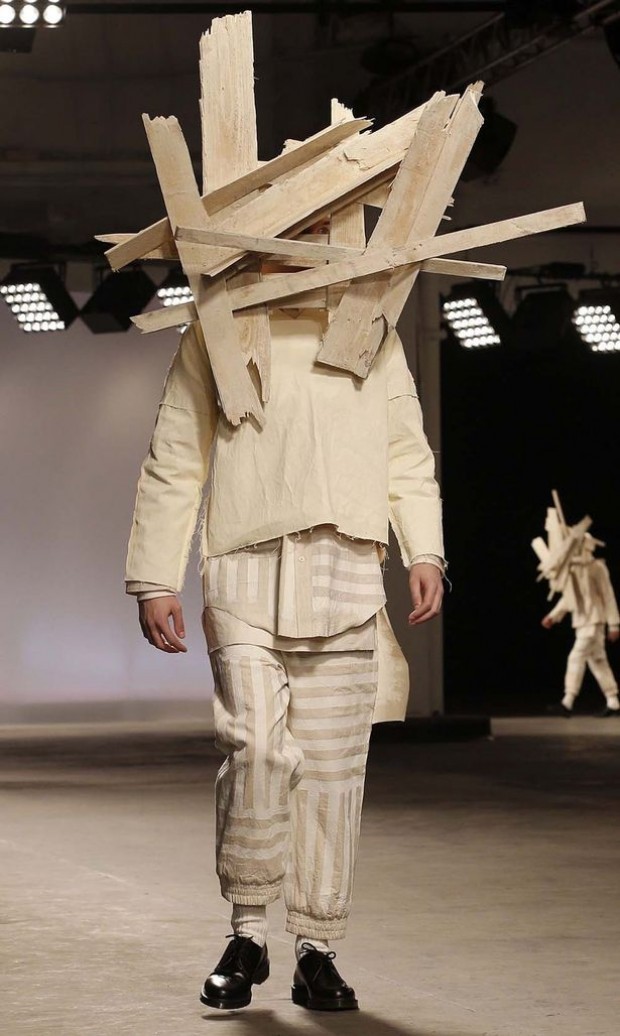 Design ini dibuat tanpa memperhatikan keselamatan bagi pemakainya. Dengan sangat unik dan nyeleneh, membuat pemakainya seperti monster yang sedang berjalan. Tampilan kayu yang tersusun berantakan dibagian wajah, membuat orang berpikir dua kali untuk memakainya. Jika Anda melihatnya mungkin akan lari ketakutan.